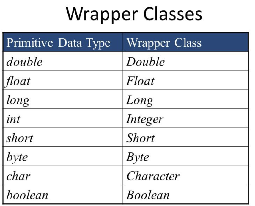 wrapper 클래스는 java.lang 패키지에 포함되어 있으며, 대응되는 기본 자료형은 아래와 같다.