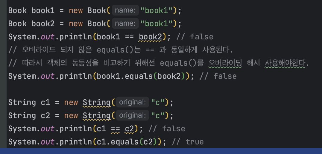 객체 book1 이 참조하는 equals() 메소드는 비교하려는 두 대상의 주소 값을 비교하여 boolean 값을 리턴한다.