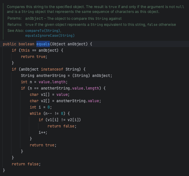 문자열을 하나씩 모두 비교해서 동일하면 true를 리턴한다. 따라서 서로 다른 객체라도 같은 문자열을 가지고 있으면 동일하다고 판단한다.